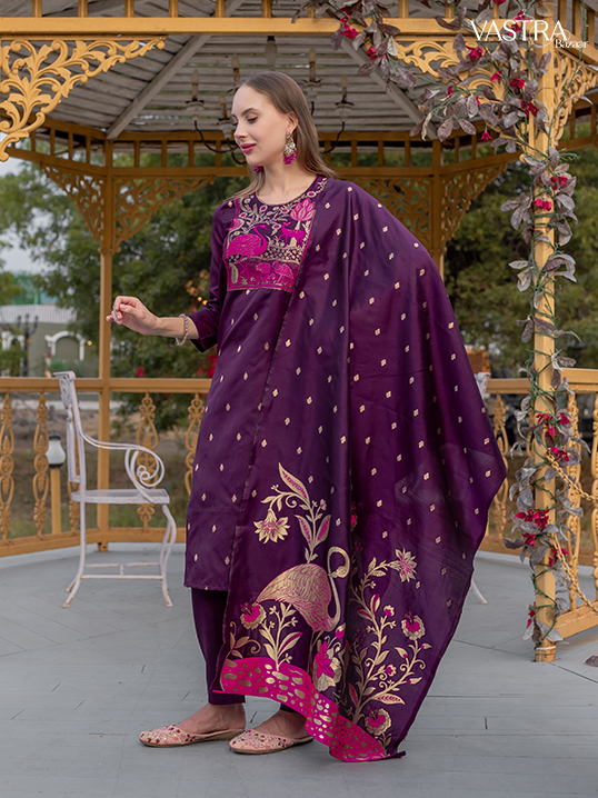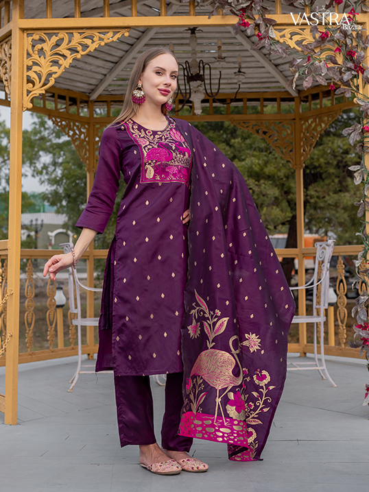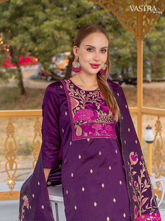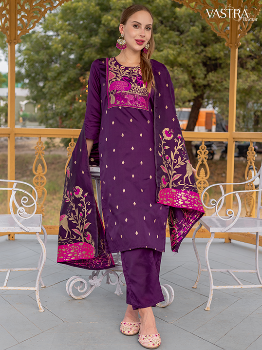 Polyester Blend Kurta With Bottom & Banarasi Silk Dupatta